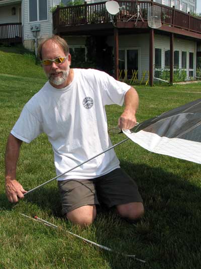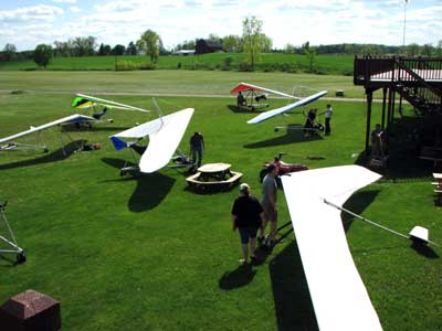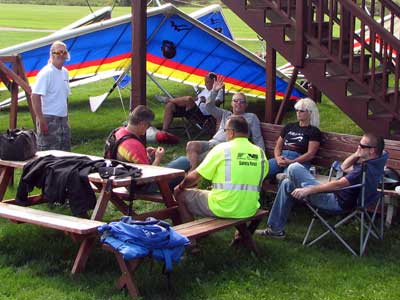The Skydog Report Wednesday September 3rd Patrick O'Donnell and I heed for Cloud 9 as the forecast says sunny and warm. We get there at 11 am and Tracy is rolling the field and we set up. Soon Tom Niblock and Brian Deimling drive in. A little later Bernie Spring and Bob red show up so we have a good group to fly with. Lisa come in around 2:30 and gets into the air Quickly. The rest of us had already taken flights and I lasted for 54 minutes and the others had 45 minute flights. Lisa blows us away staying above 4,000 feet for one hour and thirty one minutes. For most of us it was a struggle but Lisa made it look easy on her new Litespeed. We all tried a second flight but I only lasted 25 minutes on my second flight. On my first flight I had got up to 3,671 feet. Lisa's highest was 4,650 feet. Not a stellar day but well worth the drive for us. |