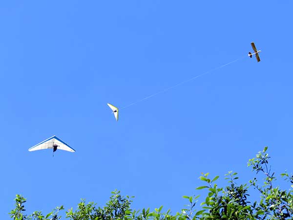 The Skydog Report Monday April 10th 2017 A few Tandems this morning and then at 1:30 eight of us went to the west side of the field where Fay Barber towed us into a cumulous filled sky. The tow was rough and I held on until 2,500 feet where Fay said can't find a good thermal so she waves me off. I go searching and don't find much and land after 20 minutes. My brother Gavin drove in to see how we were doing so I took another tow and after I pinned off I was able to find a good one up to 4,200 feet ato. I went on search mode but did not find enough to stay up with so I landed again with a 30 minute flight. Most of the others had similar flights. Fabiano took his Icaro glider up and I think that he lasted for 2-1/2 hours. Marcelo also flew and I did not hear his flight time. |